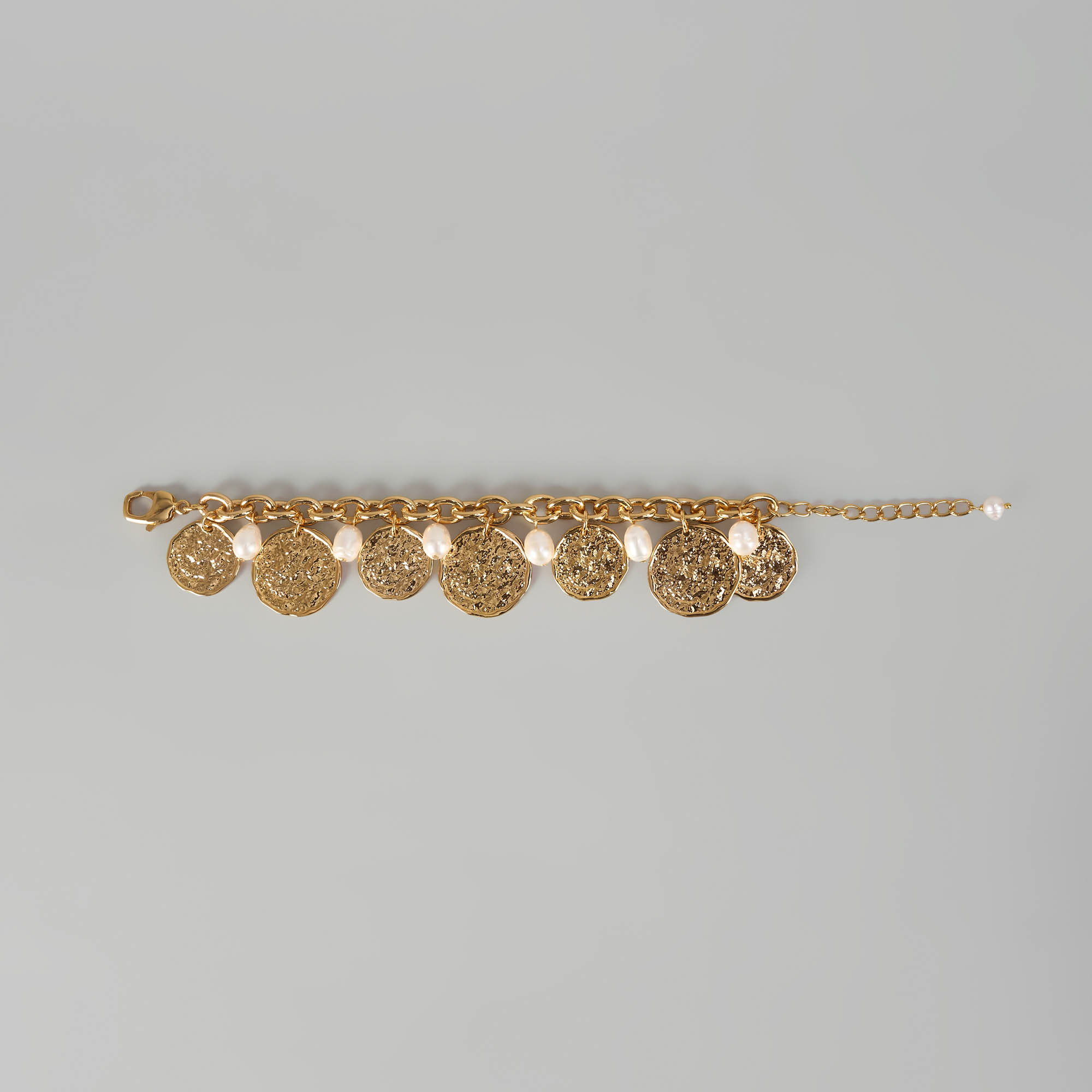 A chic 14K real gold plated chain adorned with hammered coin charms and lustrous freshwater pearl accents. This bracelet beautifully balances vintage elegance with a playful, modern twist.