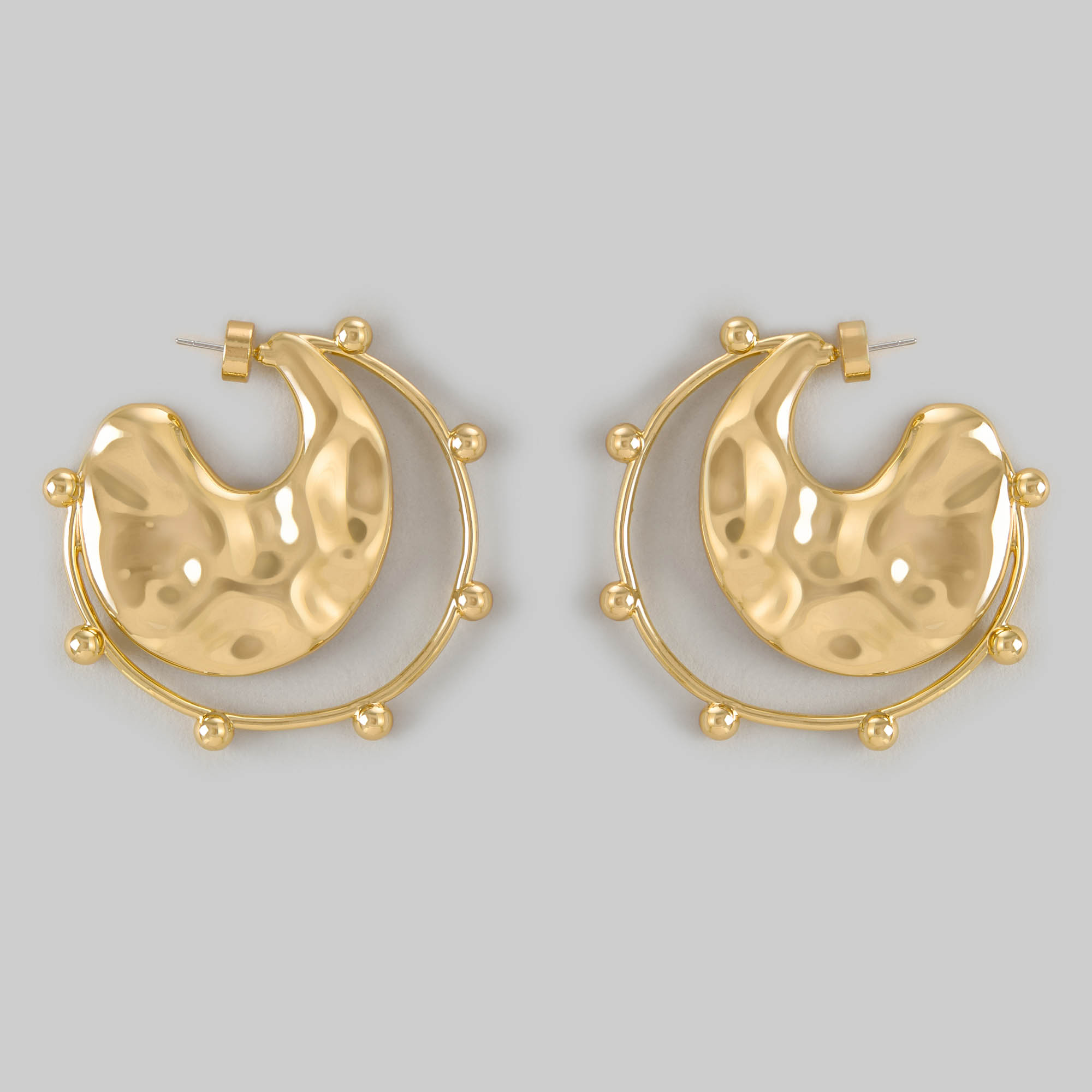 These Celestial Orbit Earrings feature a hammered crescent design within a dotted circular frame, giving them a cosmic yet chic appeal. Perfect for making a bold, modern statement with any outfit.