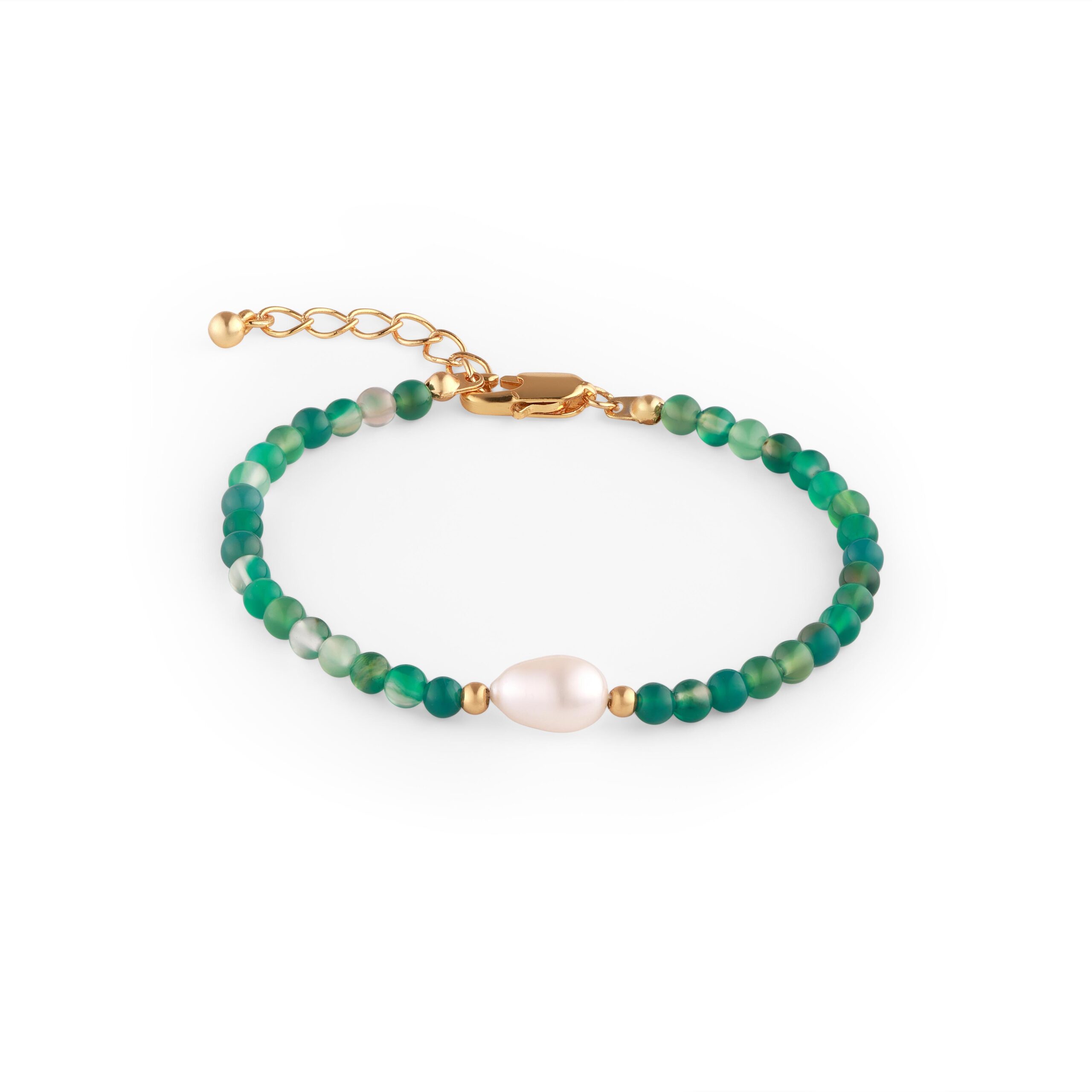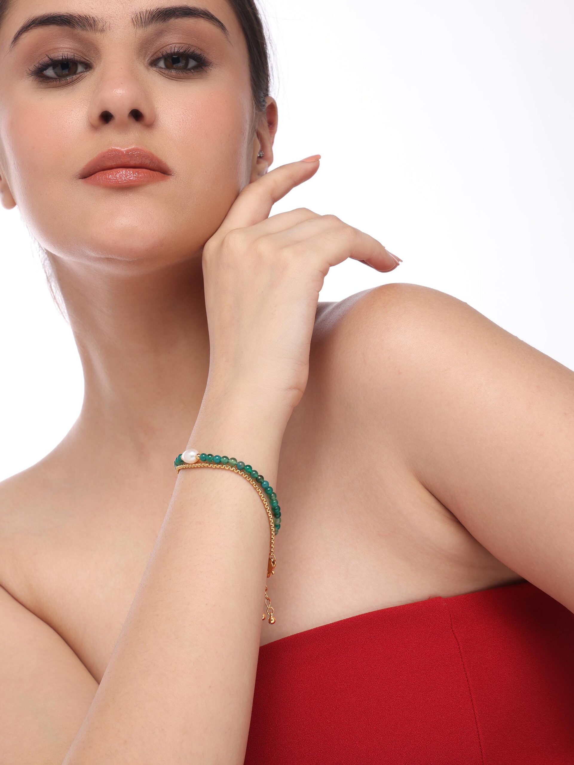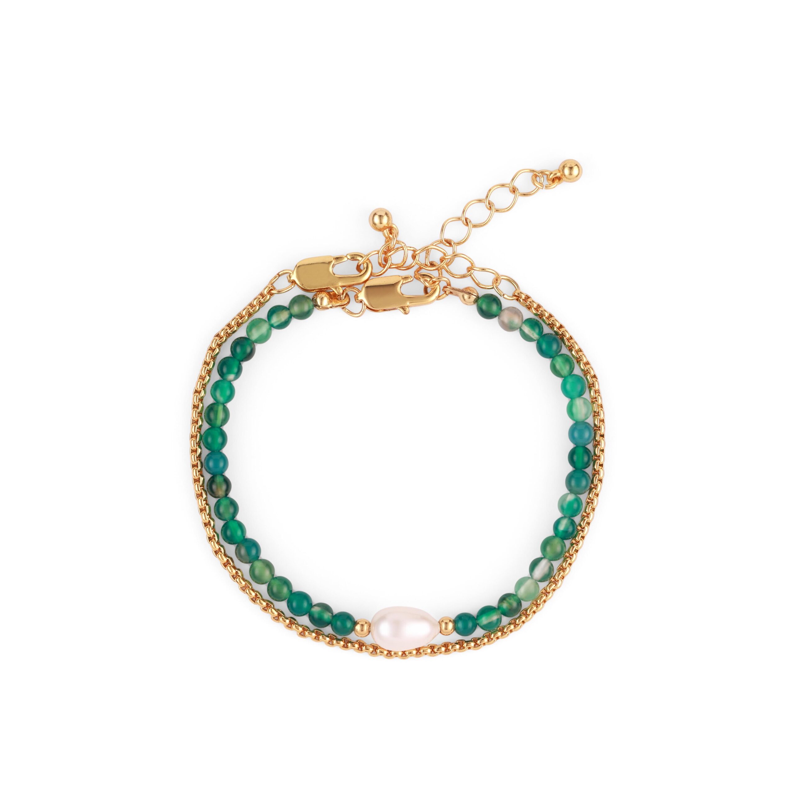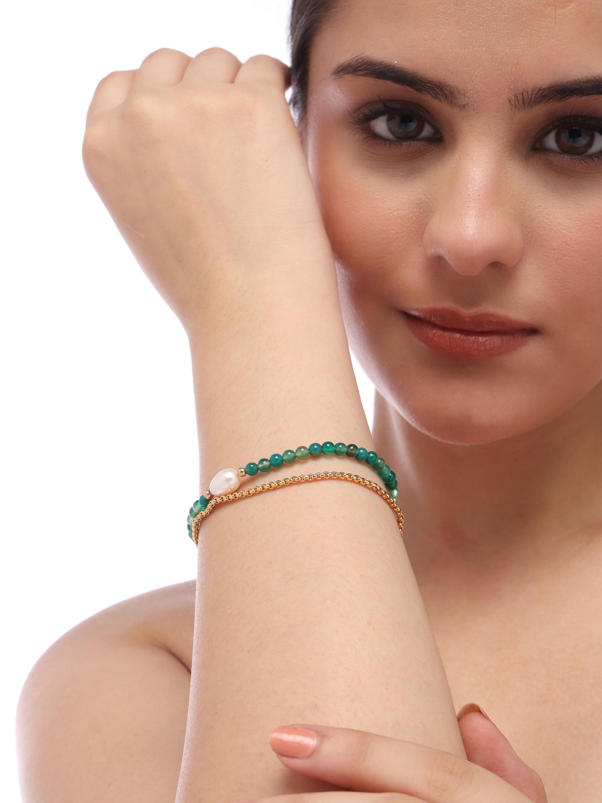 Bracelet duo featuring green agate semi-precious beads with a pearl accent, paired with a sleek golden chain — crafted in recycled brass with 14K real gold plating.