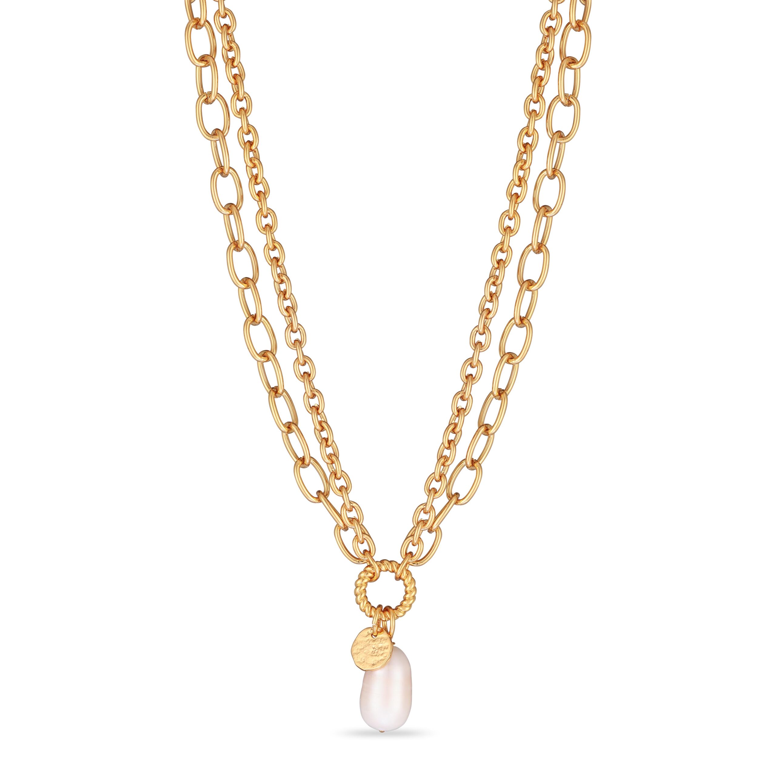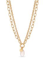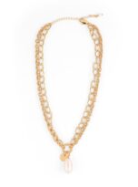 Layered gold chains meet a single freshwater pearl drop — a balance of structure and softness, crafted in recycled brass and finished with 14K real gold plating.