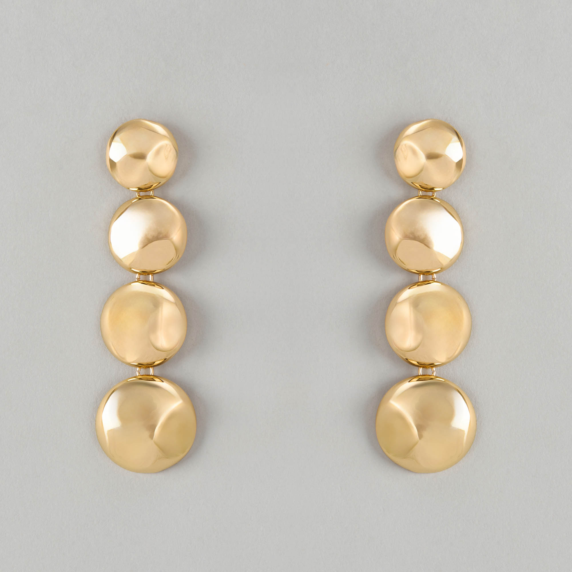 Shine with elegance in these Golden Cascade Disc Earrings, featuring a bold, multi-disc design with a high-polish finish. Perfect for making a statement at parties, weddings, or festive occasions. Lightweight yet luxurious, they add instant glamour to any outfit.